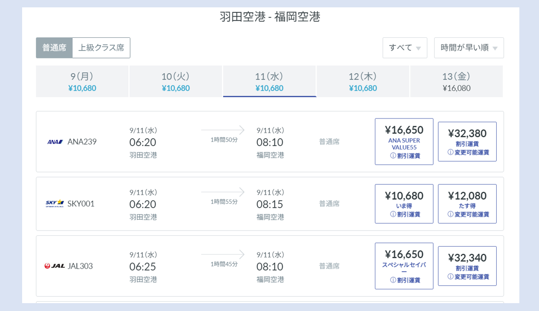 国内航空券の検索結果は、「予約変更不可タイプ」と「予約変更可能タイプ」の最安値料金が並んで表示されます。また、出発時間の順にすべての航空会社が表示されるので、一度の検索で希望するフライトが見つけることができます。